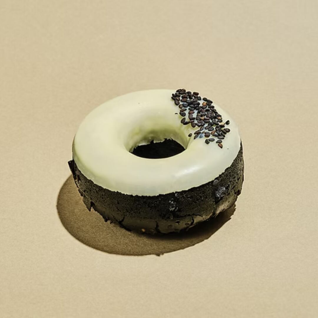 ひよこ豆や玄米粉などの栄養素の高い粉を使用。揚げずに焼きと蒸しの製法で仕上げたモチモチしっとり食感。信州のアップルソースで甘みを出し、愛知県・三河の3年熟成した琥珀色のメープルシロップのような甘さのみりんの発酵パワーも豊富に含んだ栄養満点で可愛いドーナツの黒ごま味。